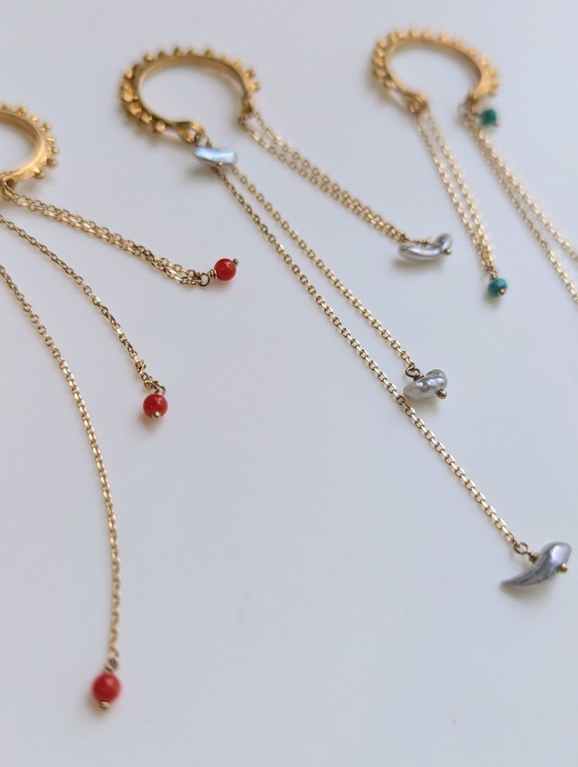 ピアスポストなしで楽しめるイヤーカフス。 着け心地の良さから沢山の方にご愛用頂いているアイテムに、芥川龍之介の"蜘蛛の糸"からインスパイアされた新作が登場しました。 美しい天然石が繊細に揺れる、存在感と儚さを合わせ持った一品。 見た目以上に軽く、耳のストレスを感じさせません。 ショートタイプと合わせての装着もおすすめです。 装着は耳の薄い上から差し込んで下にスライド。 説明書が付きます。 ①Pink city ピンクトルマリン、ローズクォーツ、淡水パール、芥子パール。 ピンクシティと呼ばれるインドの宝石の街Jaipurのイメージで。 女性らしい、肌馴染みする柔らかい印象のピンクです。 ②White daydream ホワイトトパーズ、ブルームーンストーン、淡水パール、ホワイトオパール。 幻想的な白〜透明の天然石を使用しました。 真夏から真冬にも映える一品です。 ③Blue night アイオライト、アパタイト、ブラックスピネル、ラブラドライト。 グレー〜青〜濃紺〜黒とグラデーションとコントラストを活かした色合い。 シックな中に華やかさのある一品です。 ④Summer dream 芥子パール、アクアマリン、サンゴ、淡水パール、トルコ石。 夏の海をイメージさせる天然石を使った、この季節限定アイテム。 ✴✴✴✴✴✴✴✴✴✴✴✴✴✴✴✴✴✴✴✴✴✴✴ kumonoito 天界から舞い降りたきらめき 儚くも美しいチェーンと輝石が織りなす瞬き 耳元にそっと添えると あなただけの物語が始まる ✴✴✴✴✴✴✴✴✴✴✴✴✴✴✴✴✴✴✴✴✴✴✴ 在庫売り切れの際には、オーダーにて、約3週間で製作致します。 使用している天然石が終了した際は、色合いを優先して異なる種類の天然石を使用する場合がございます。ご了承下さいませ。 【素材】シルバー(K18メッキ),K10チェーン,天然石 【サイズ】チェーン長さ∶約8cm