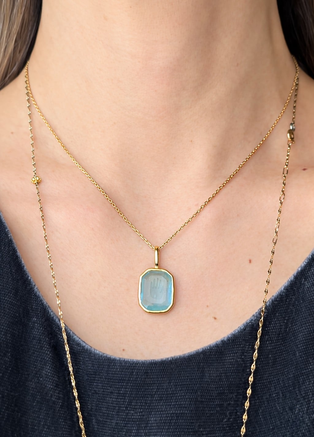 ブッダの右手を彫刻したアクアマリンを、K18でセッティングした一点もののペンダントです。