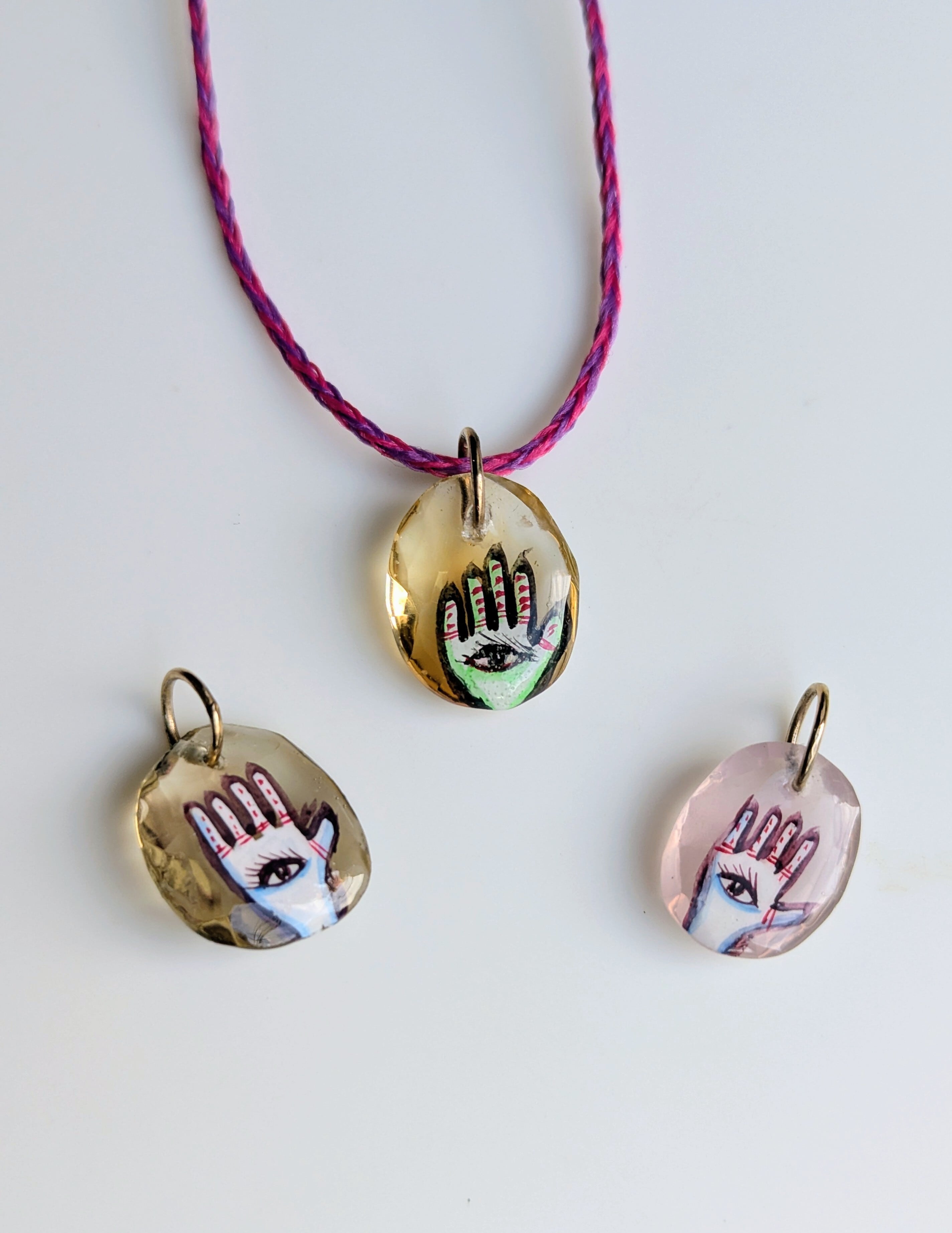 手の中に目がデザインされたモチーフには、邪視から身を守るための護符や、聖なる加護の力が宿るとアラビア〜イスラム社会で信じられています。