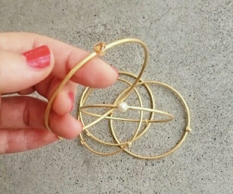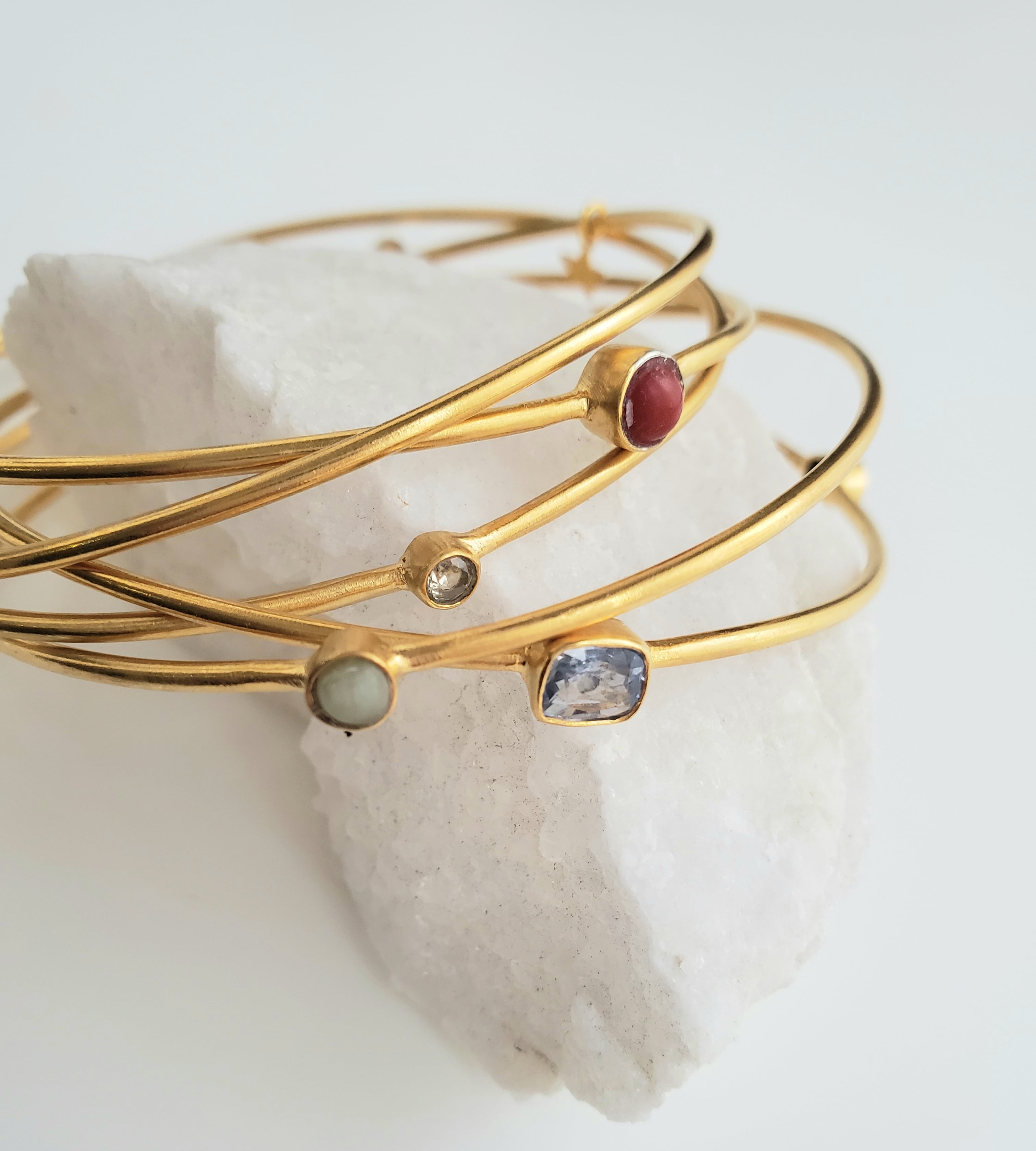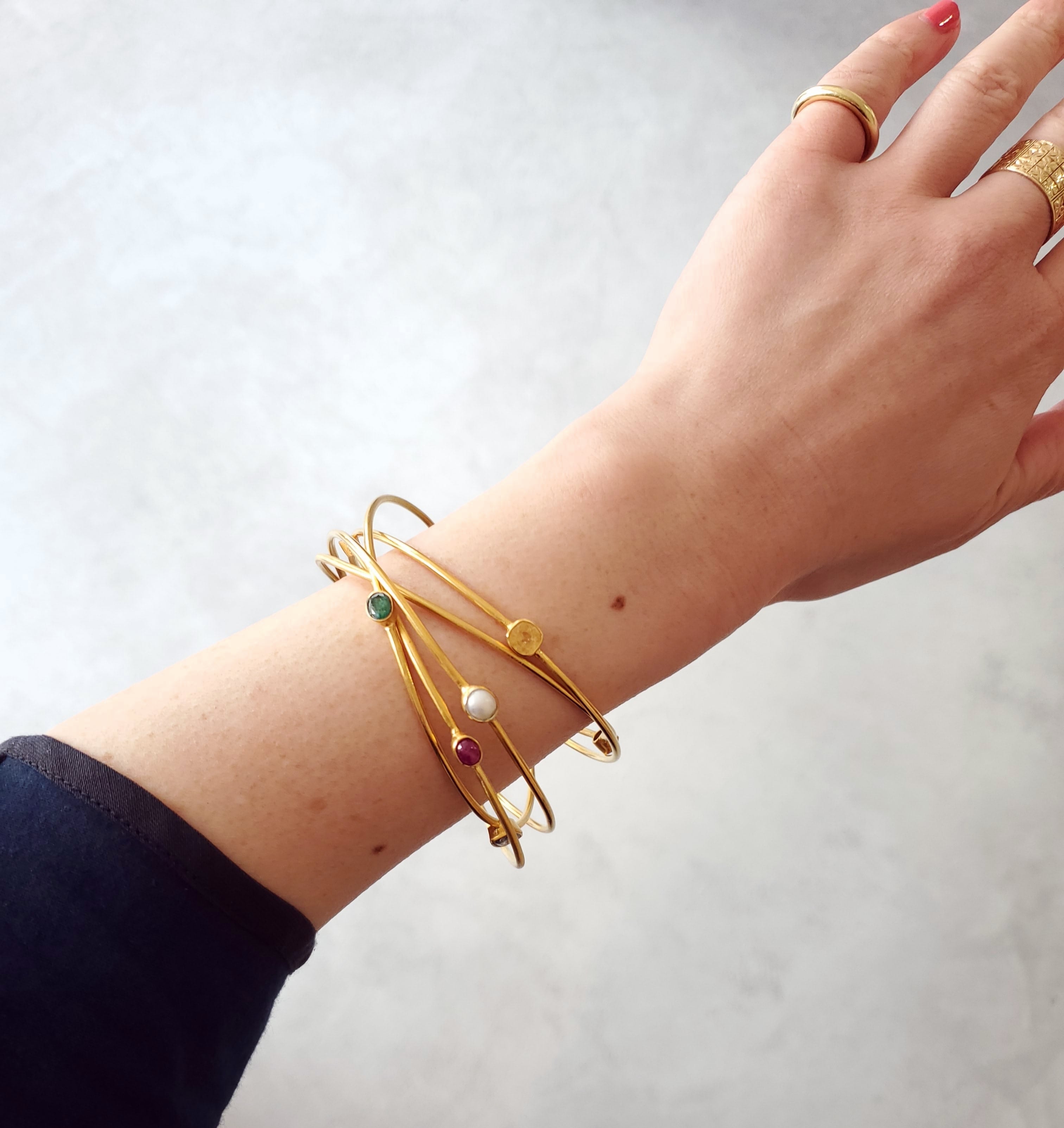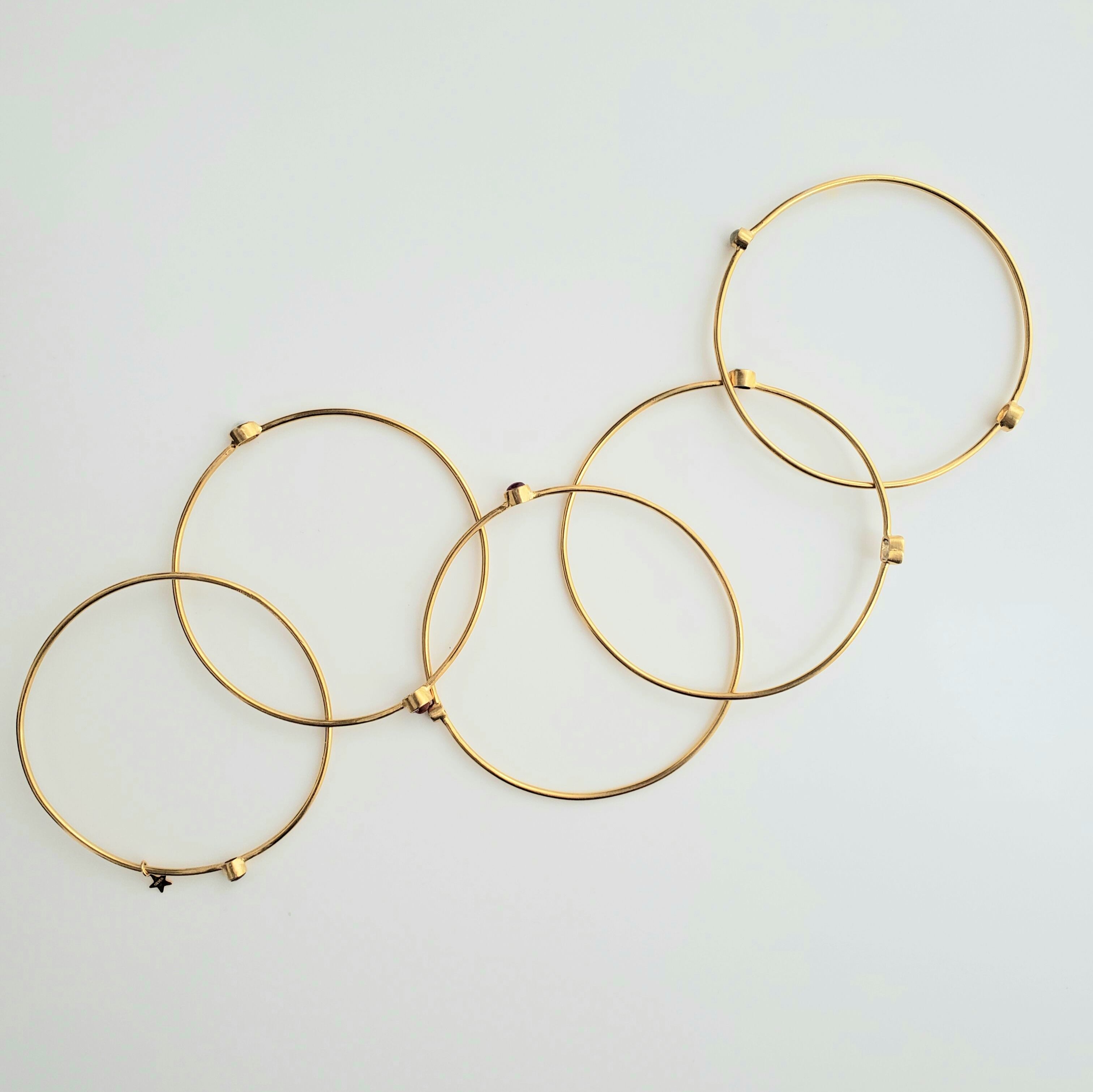 惑星と呼応する9つの天然石を5つの輪(バングル)に配置し、惑星の軌道に見立てた9 stones Bracelet。