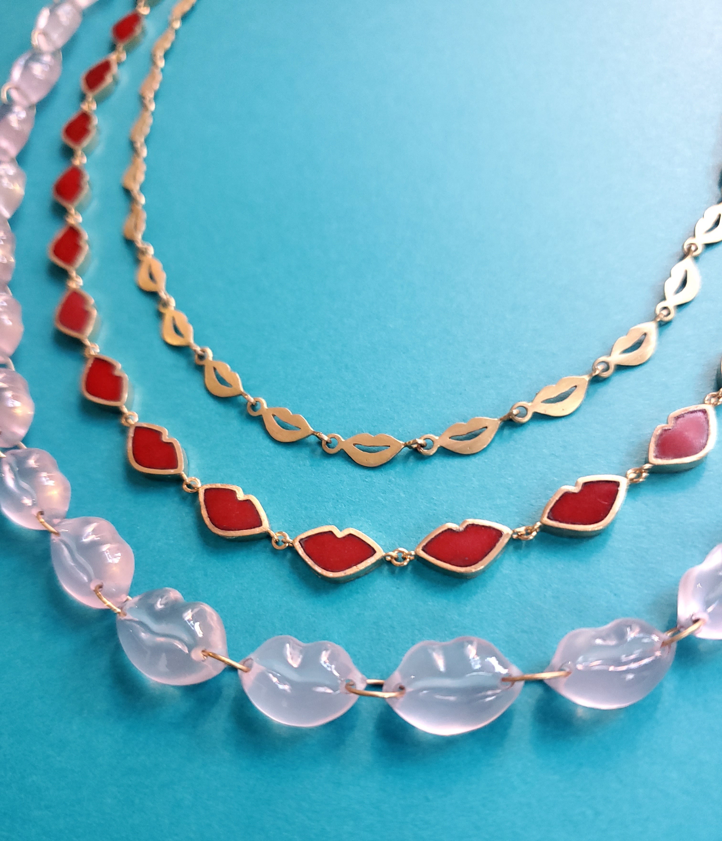 マットで明るいレッドリップが楽しい会話をしているような、大人の女性のためのネックレスです。