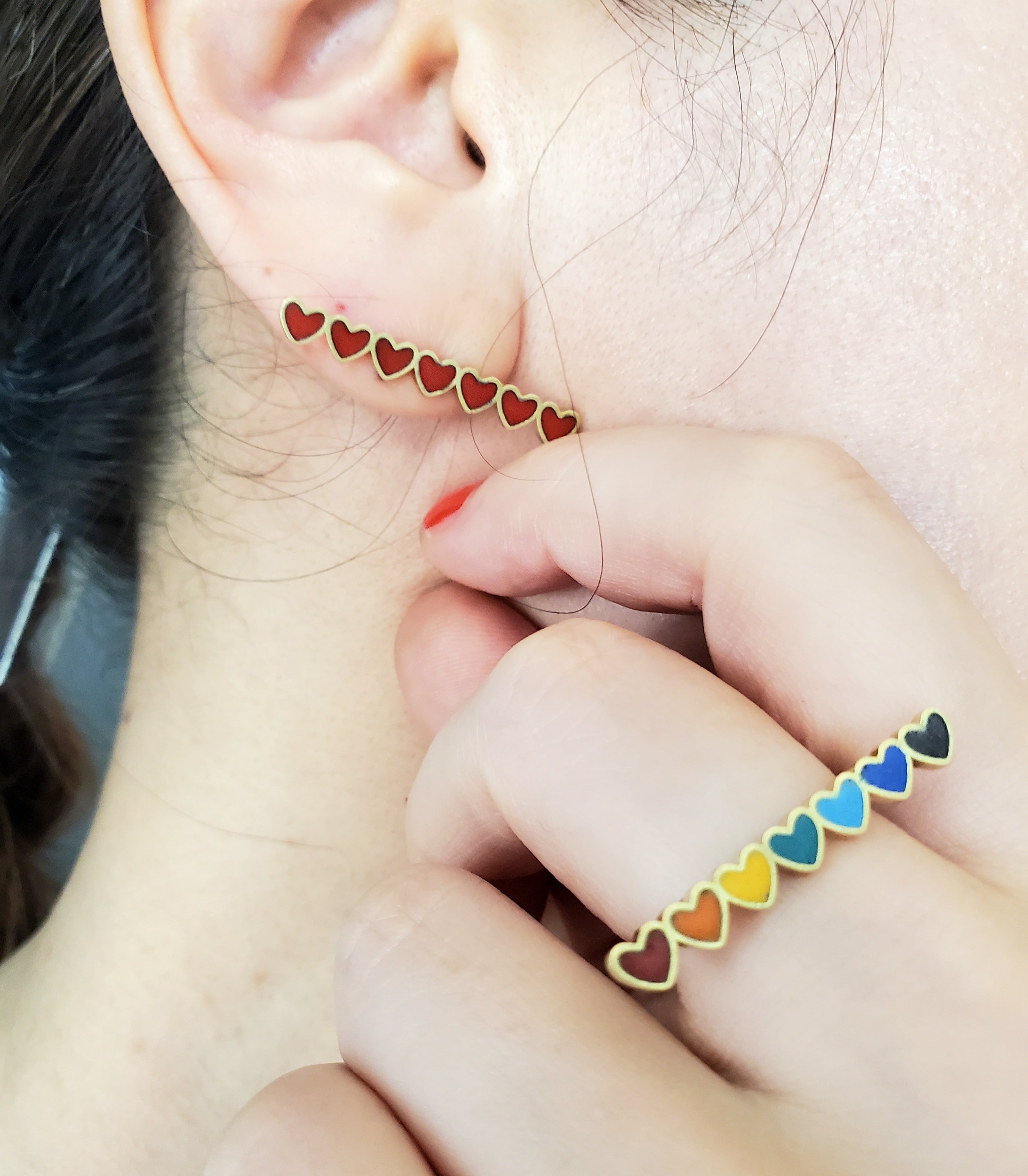 オリジナルの18金のハートモチーフに800℃の炉でガラスを焼き付け製作しています。